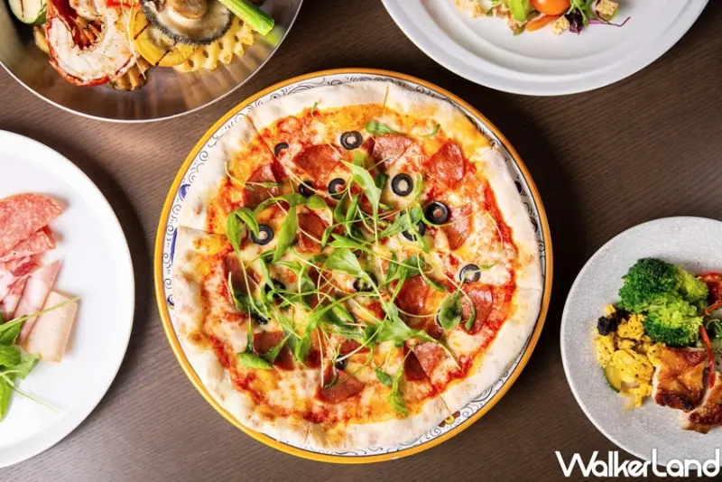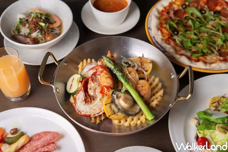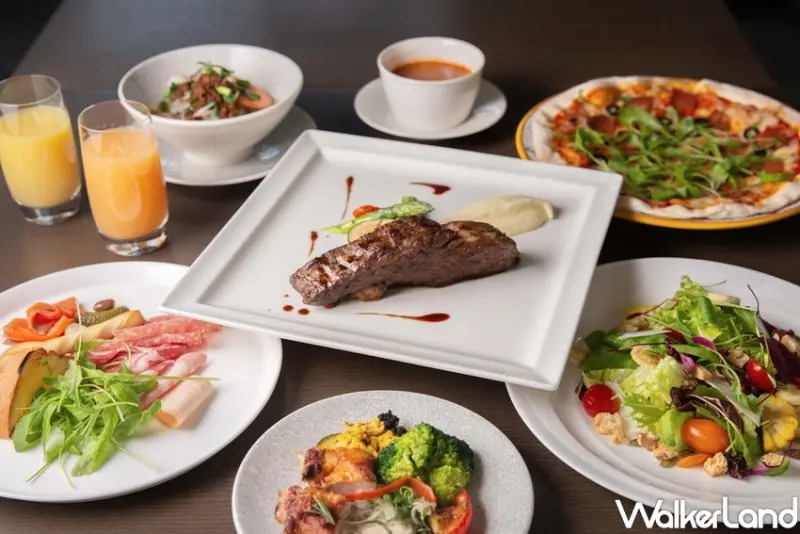 自助餐檯還包括義式蜜瓜火腿、挪威煙燻鮭魚等開胃菜,以及冷肉起司檯,還有各款精湛熱食、義式燉飯或義大利麵、純手工義式Pizza、熱騰騰的現煮麵點,以及精美甜點、鮮果、飲品及哈根達斯冰淇淋BAR等(自助餐檯各品項或隨時令及供貨狀況更迭),加「180元起」還能享用各款豐美主菜,如厚煎美國牛肉培根艾曼塔起司堡、爐烤春雞、碳烤美國肋眼牛排等。