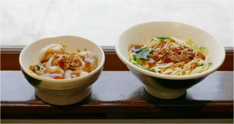 門口的竹柏綠意盎然,建築主體洗石子牆面、和洋風格、橢圓形窗櫺、圓柱處處皆充滿了歲月感,一踏進門立即感受到當年的風華,屋內修繕得十分完整,檜木木樑與地磚呈現出當年的美感。隨意找個地方坐下,菜單上的餐點價格十分平實,無論是粄條、乾麵,或是必點的水晶餃,每一道都是既樸實又合胃口的美味。![]()