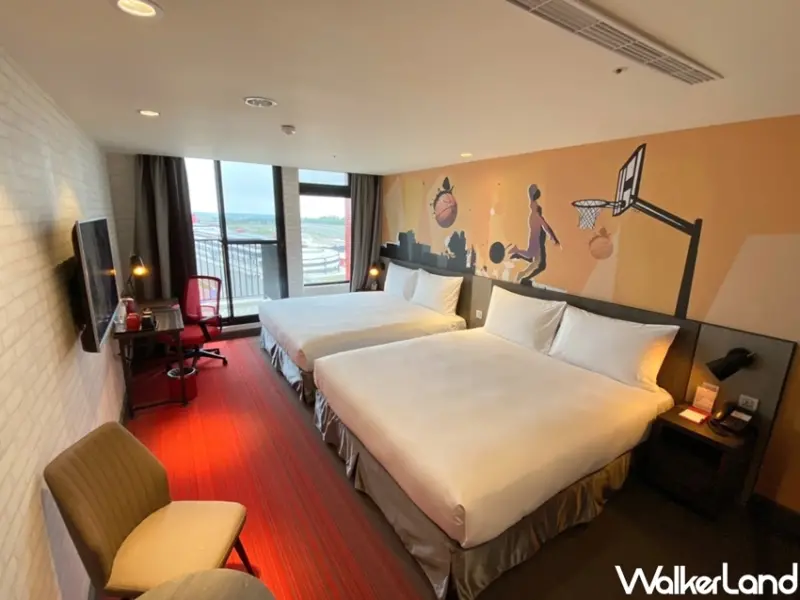 並且,房間設計上充滿運動元素,及後現代工業風,從衣櫃、床頭櫃,連備品都是賽道包裝。此外,還有讓3C重度使用者的車迷們來說,相當貼心的設備是,房間提供多處插座,可同時充電9組手機、平板、相機都沒問題。