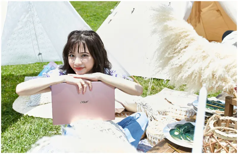 擁有超可愛甜美少女外型的人氣網美Nina,這一次選擇以夏日女孩必備的吊帶褲搭配粉色Acer Swift 1,希望在這如詩如畫的場景中,體驗一下戶外悠閒追劇的難得體驗。