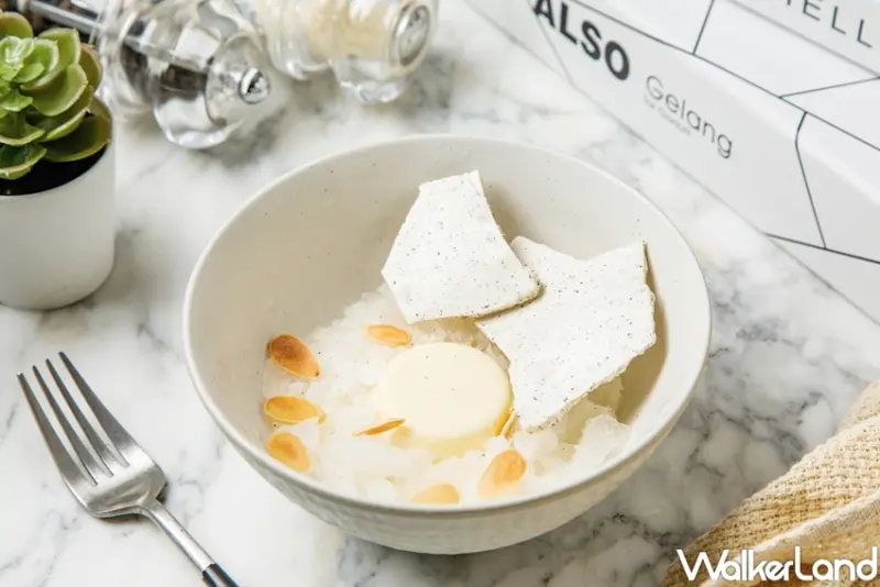 還有甜點「白蘆筍巴戈露」,猶如拆禮物般敲碎頂層的伯爵茶蛋白餅,融合白蘆筍白巧克力bavarois及蘆筍清冰、洋甘菊泡泡、香脆杏仁片一起入口,帶有伯爵茶幽香的輕脆蛋白餅與綿柔香甜bavarois形成對比卻和諧的口感,尾韻帶有蘆筍與洋甘菊清香,為豐富白蘆筍盛宴劃下美好句點。