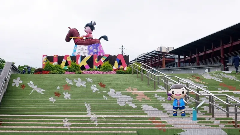 打破一般文化館的刻板印象,來到桃園市客家文化館,第一時間被會被3D彩繪階梯吸住眼球,而階梯上騎著客家印花布馬的Q版公仔,也是這裡的著名地標。
