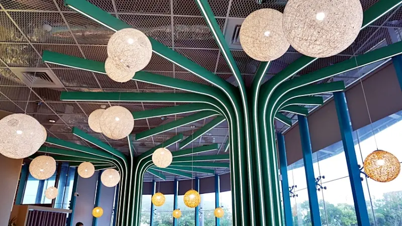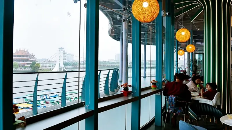 變身後的龍潭觀光大池,除了水]上活動,更於湖畔設置遊客中心與景觀餐廳,其中擁有高人氣的龍咖啡就是坐落於此處二樓,不僅能以全景視角將龍潭大池景致納入眼底,店內造景也是不容小覷,挑高落地窗搭配宛如大樹般的綠柱,上頭衍伸出一顆顆造型圓球,成功營造出與眾不同的美感。
