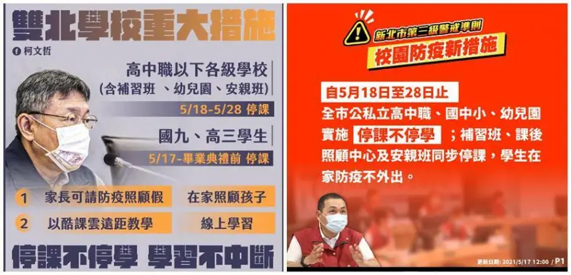 同時,因應疫情,台北市長柯文哲、新北市長侯友宜同時宣布,雙北市政府宣布即日起高中以下停課到5月28日,包含公私立高中職、國中小、幼兒園、補習班、安親班、課後照顧中心、托嬰中心。 並且,勞工家長有12歲以下兒童或國高中以下身心障礙子女需照顧者,可請「防疫照顧假」,雇主都應予准假,至於工資部分,未強制雇主給薪,可由勞資雙方協商。
