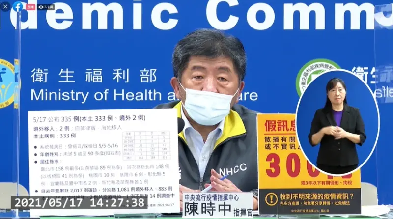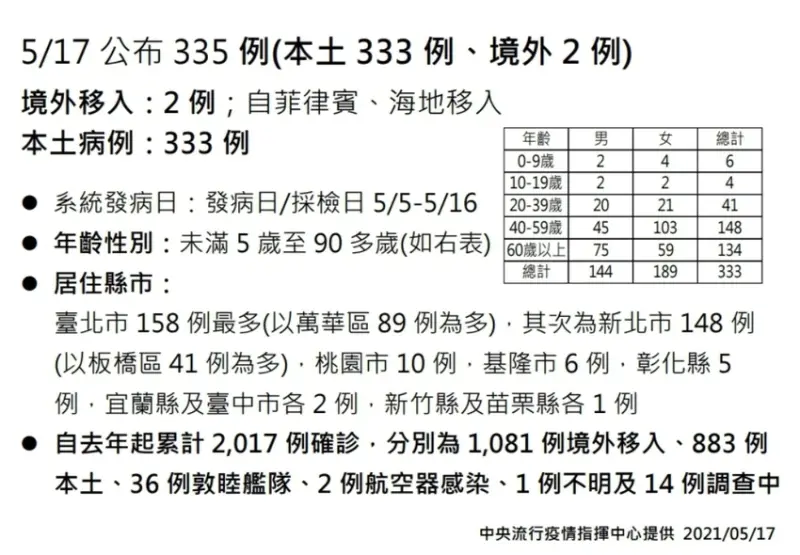 雙北人辛苦了,請一定要好好宅在家、減少外出、戴緊口罩。中央流行疫情指揮中心今(17)日公布國內新增335例COVID-19確定病例,分別為333例本土(案1684至案2016)及2例(案2017、案2018)境外移入。截至目前國內累計245,801例新型冠狀病毒肺炎相關通報(含236,103例排除),其中2,017例確診。![]()