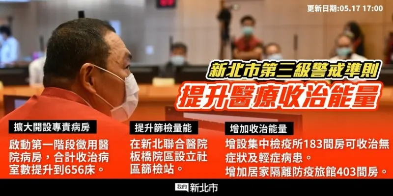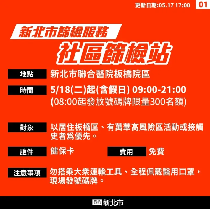 疫情飆升,新北市不僅要將境內醫院降載來提升收治量,輕症、無症狀病患送往集中檢疫,由醫療團隊進駐管理。在板橋聯醫院設立社區篩檢站,篩檢對象為居住板橋區、有萬華高風險區活動或接觸史者為優先,並請攜帶健保卡,並全程配戴醫用口罩,建議不要搭乘大眾運輸工具前往現場。此外,若是不方便前往的話,也可自行到新北市17家採檢醫院篩檢。