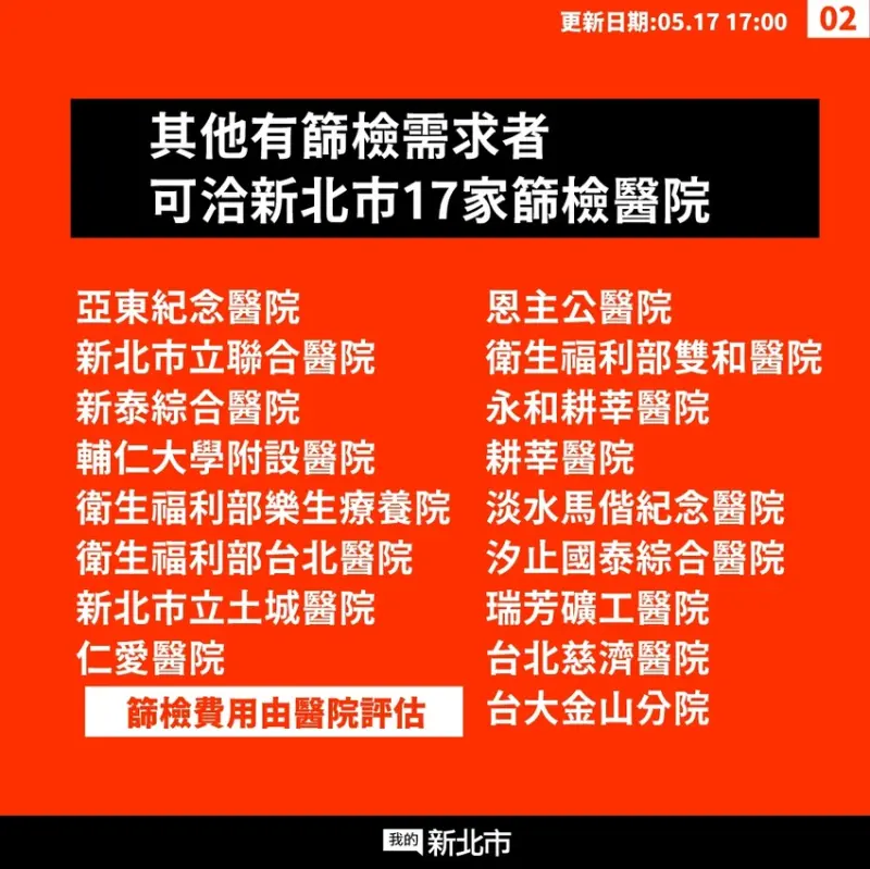 隨著新北市疫情升溫,其中板橋地區為最多確診的地區,因此,新北市長侯友宜宣布今(17)日在新北聯醫板橋院區設立社區篩檢站,將提供「目前以居住板橋區、有萬華高風險區活動或接觸史者」優先免費篩檢服務。此外,新北市也有17間醫院提供採檢、篩檢。![]()