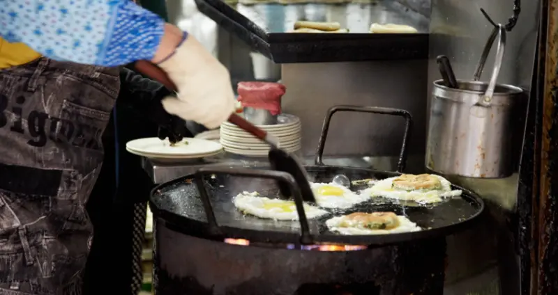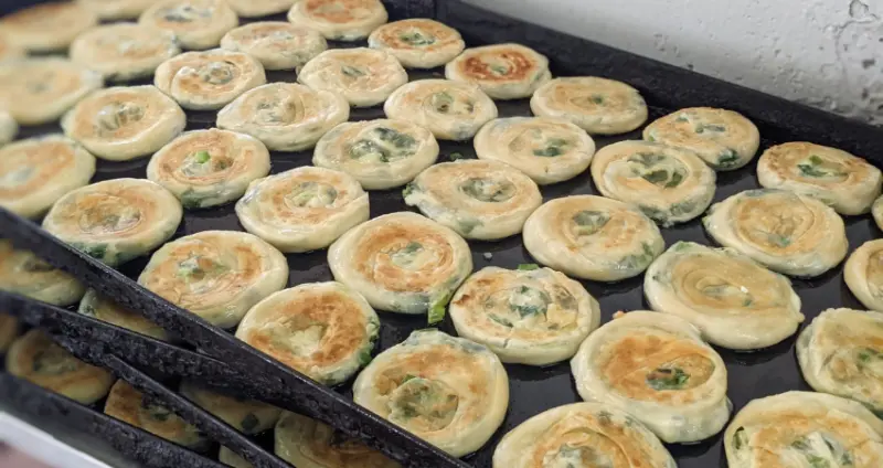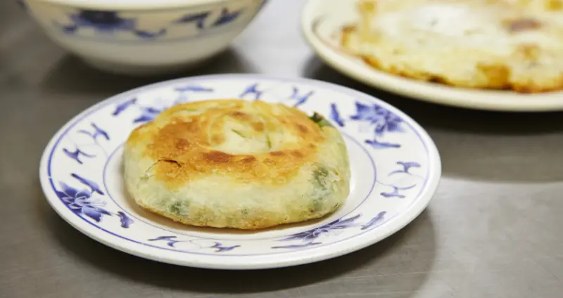 每日天未亮,「周家蔥油餅」已開始一天的忙碌,工作人員在店門口忙著將蔥餅麵團先下鍋壓扁後煎半熟,轉頭再將一大盤蔥餅放入身後的烤箱中,忙碌的身影也對照著其高人氣,因為此時門內、外已逐漸排上絡繹不絕的人潮。多年來經過多回改良,才能端出最迷人的滋味,像是招牌蔥油餅去除油膩味後口感酥脆,一口咬下蔥香撲鼻、外酥內軟,蔥花控一定會喜歡;而另一大招牌品項餛飩湯,原是一口湯、一口蔥油餅最合拍組合,近年餛飩湯停售後,也可現場買生餛飩,延續味蕾滿溢著幸福的滋味。