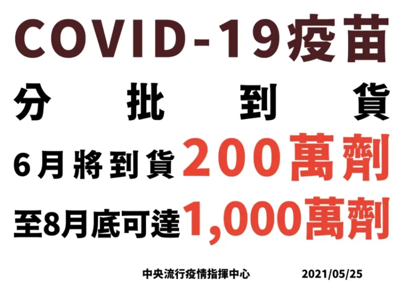 指揮官陳時中補充說明:下個月疫苗會分批到貨,會有期限問題,在6月預計會有200萬劑進來,8月底應該有1千萬劑,希望供應廠商能以這樣的時程持續供應,也呼籲COVAX平台不要因為其他因素干擾進貨時程。
