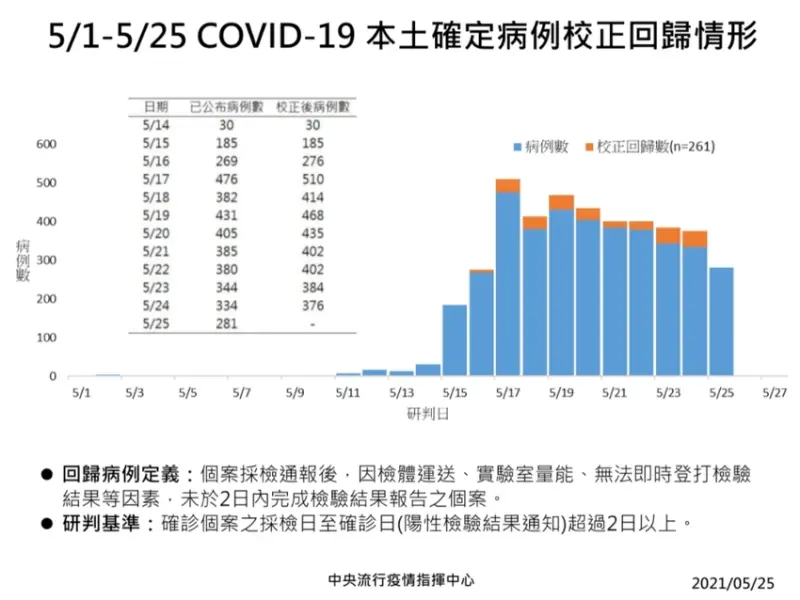 此外,本日校正回歸個案261例中,為162例男性、99例女性,年齡介於未滿10歲至90多歲,發病日介於5月2日至5月22日;個案分布以臺北市155例最多,其次為新北市89例,宜蘭縣、桃園市各5例,基隆市及彰化縣各3例,臺中市1例。