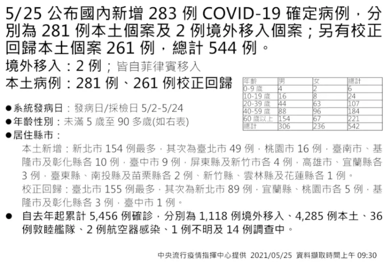 中央流行疫情指揮中心表示,今日(5/25)新增之281例本土病例,為144例男性,137例女性,年齡介於未滿5歲至90多歲,發病日介於今(2021)年5月7日至5月24日。個案分布以新北市154例最多,其次為臺北市49例,桃園市16例,臺南市、基隆市及彰化縣各10例,臺中市9例,屏東縣及新竹市各4例,高雄市、宜蘭縣各3例,臺東縣、南投縣及苗栗縣各2例、新竹縣、雲林縣及花蓮縣各1例。![]()