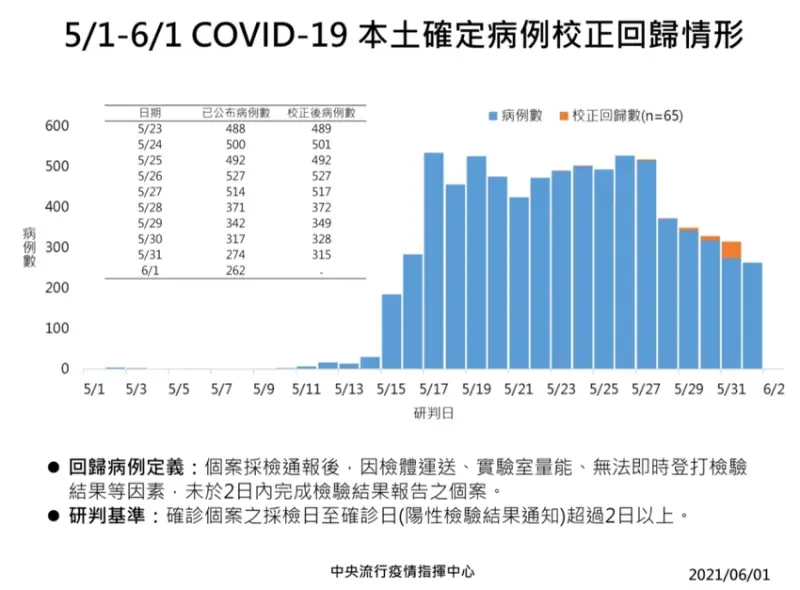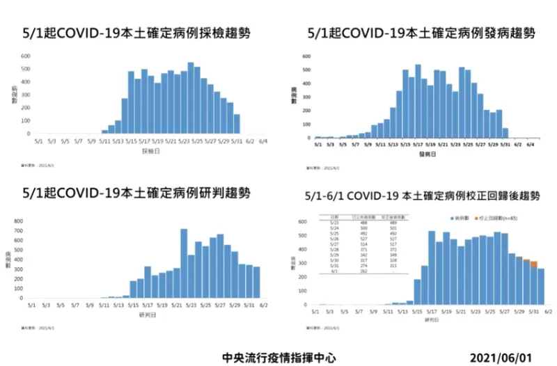 中央流行疫情指揮中心今(1)日公布國內新增之262例本土病例,為136例男性、126例女性,年齡介於未滿5歲至90多歲,發病日介於今(2021)年5月20日至5月31日。另校正回歸個案65例中,為31例男性、34例女性,年齡介於未滿5歲至90多歲,發病日介於5月20日至5月30日。![]()