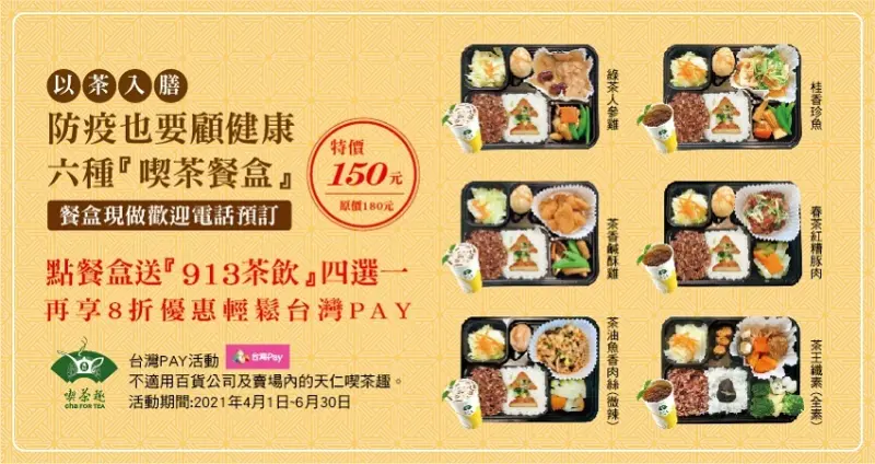 天仁喫茶趣推出「喫茶餐盒」,讓您不用到店裡也能吃到人氣茶膳,還隨餐附贈經典913茶飲,即日起外帶自取就享優惠價,只要一通電話現點現做,回家立馬享美食。此外,也配合Uber Eats、Foodpanda雙外送平台,不必出門好料也都幫你送到家!全台門市同時採取高規格防疫措施,全力做好5大安心防疫,與您攜手渡過疫情關鍵期。