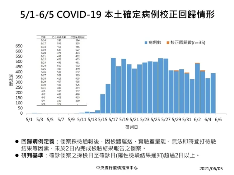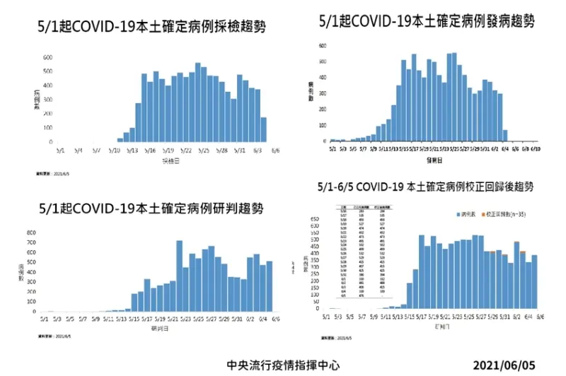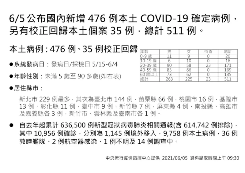 中央流行疫情指揮中心今(5)日公布國內新增之476例本土病例,為248例男性、205例女性,另有23例外籍人士性別待確認,年齡介於未滿5歲至90多歲,發病日介於今(2021)年5月15日至6月4日。另校正回歸個案35例中,為15例男性、20例女性,年齡介於未滿10歲至80多歲,發病日介於今年5月24日至6月1日。![]()