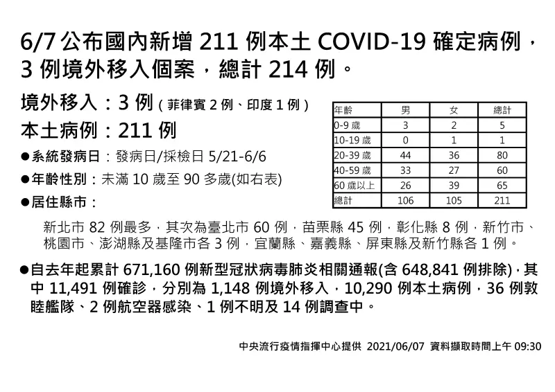 中央流行疫情指揮中心今(7)日公布國內新增之211例本土病例,為106例男性、105例女性,年齡介於未滿10歲至90多歲,發病日介於今(2021)年5月21日至6月6日。