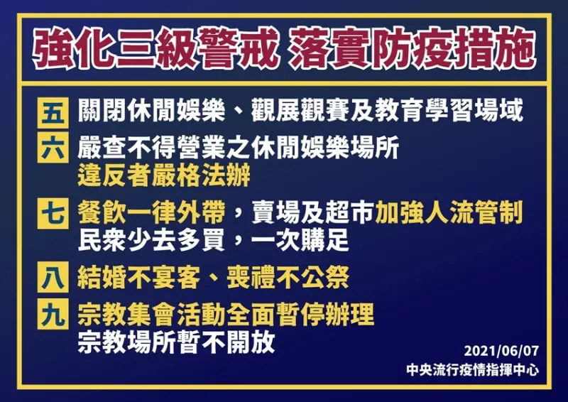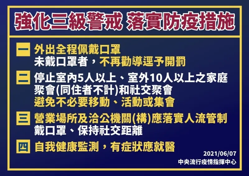 指揮官陳時中表示:民眾外出就要全程配戴口罩,且不再勸導,將會直接開罰。另休閒娛樂場所嚴查不得營業、全國餐飲業一律外帶,賣場及超市加強人流管制,並呼籲民眾少去多買,一次購足;結婚不宴客,喪禮不公祭;宗教集會活動全面暫停辦理。
