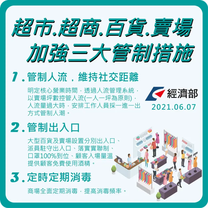 一、管制人流,維持社交距離:各賣場已明定核心營業時間,透過人流系統管制系統以賣場坪數(一人一坪為原則)控管人流,人流量過大時,安排工作人員採一進一出方式管制人潮,確保賣場防疫距離安全,以作好場內場外的管理。