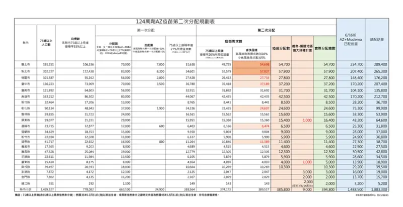 而針對國人關心的疫苗問題,中央流行疫情指揮中心表示,為提升目前優先接種COVID-19疫苗對象之接種率,將於6月17日起,依各縣市75歲以上人口比率,進行第二次疫苗撥配,預計配送394,800劑。