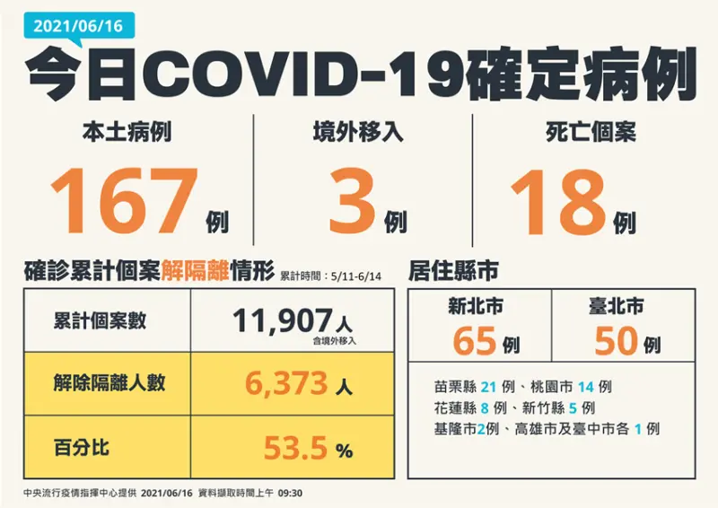 中央流行疫情指揮中心今(16)日公布國內新增167例本土病例,為85例男性、82例女性,年齡介於未滿5歲至90多歲,發病日介於今(2021)年6月1日至6月15日。個案分佈以新北市65例最多,其次為臺北市50例,苗栗縣21例,桃園市14例,花蓮縣8例,新竹縣5例,基隆市2例,高雄市及臺中市各1例。其中雙北地區以外縣市52例中,48例為已知感染源、4例關聯不明;相關疫情調查持續進行中。![]()