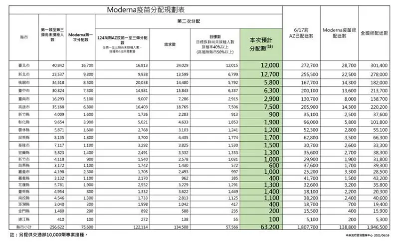 關於第二批AZ疫苗配送,指揮官陳時中表示:明天開始配送,同時通知各縣市疫苗數量,此外也將配送莫德納疫苗6萬3200劑,為針對第一至三類人員施打,莫德納施打速度不算是特別快,也會分配1萬劑給予交通部對機場、邊境等相關人員接種,防範新冠病毒變種病毒株的入侵。