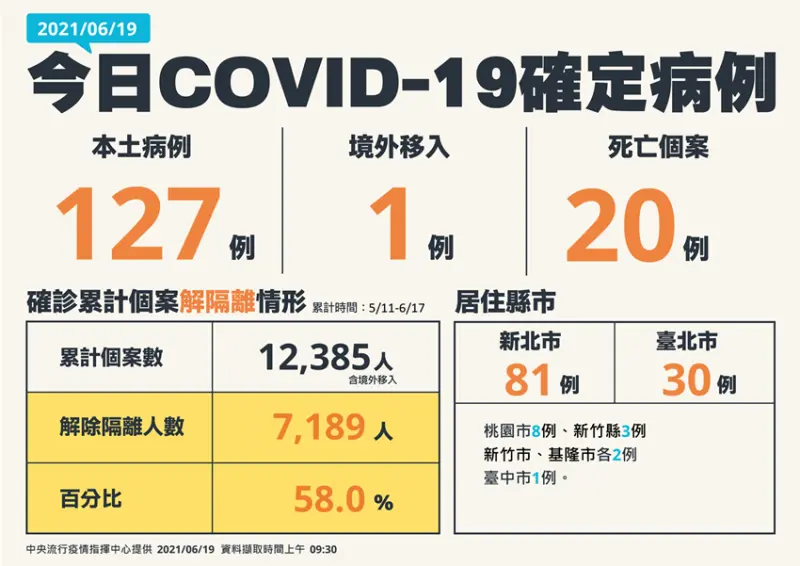 中央流行疫情指揮中心今(19)日公布國內新增之127例本土病例,為60例男性、67例女性,年齡介於未滿5歲至90多歲,發病日介於今(2021)年6月3日至6月18日。個案分佈以新北市81例最多,其次為臺北市30例,桃園市8例,新竹縣3例,新竹市、基隆市各2例,臺中市1例。其中雙北地區以外縣市16例中,12例為已知感染源、4例關聯不明;相關疫情調查持續進行中。![]()