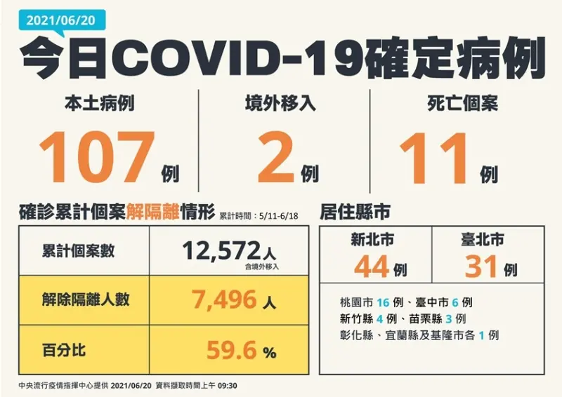 中央流行疫情指揮中心今(20)日公布國內新增107例本土病例,為57例男性、50例女性,年齡介於未滿5歲至100多歲,發病日介於今(2021)年6月4日至6月19日。個案分佈以新北市44例最多,其次為臺北市31例,桃園市16例,臺中市6例,新竹縣4例,苗栗縣3例,彰化縣、宜蘭縣及基隆市各1例。其中雙北地區以外縣市32例中,27例為已知感染源、2例關聯不明、3例疫調中;相關疫情調查持續進行中。![]()