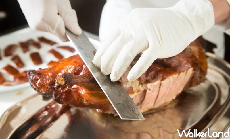 主廚嚴選5個月大的宜蘭櫻桃鴨,經過洗淨、添料醃製、上脆皮水、風乾等繁複程序後,先低溫熟成72小時,進爐低溫慢烤10小時,取出後靜置1小時以鎖住肉汁精華,再進爐以280度高溫烤10分鐘至外皮金黃酥脆。