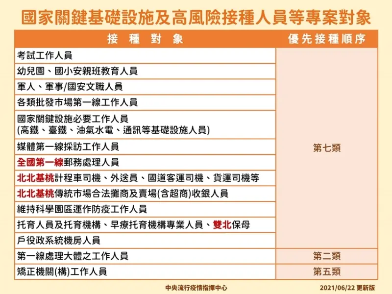 此外,針對第七類接種對像「維持國家安全及社會機能正常運作者」,包含了,考試工作人員;幼兒園、國小安親班教育人員;軍人、軍事/國安文職人員;各類批發市場第一線工作人員;國家關鍵設施必要工作人員 (高鐵、臺鐵、油氣水電、通訊等基礎設施人員);媒體第一線探訪工作人員;全國第一線郵務處理人員;北北基桃計程車司機、員、國道客司機、貨運司機等;北北基桃傳統市場合法攤商及賣場(含超商)收銀人員;維持科學園區運作防疫工作人員;托育人員及托育機構、早療托育機構專業人員、雙北保母;戶役政系統機房人員。