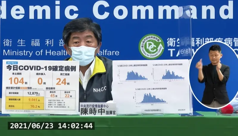 中央流行疫情指揮中心今(23)日公布國內新增104例本土病例,為45例男性、59例女性,年齡介於未滿5歲至80多歲,發病日介於今(2021)年6月10日至6月22日。個案分佈以新北市45例最多,其次為臺北市22例,高雄市及新竹縣各9例,桃園市7例,苗栗縣4例,基隆市3例,宜蘭縣2例,彰化縣、南投縣及屏東縣各1例。