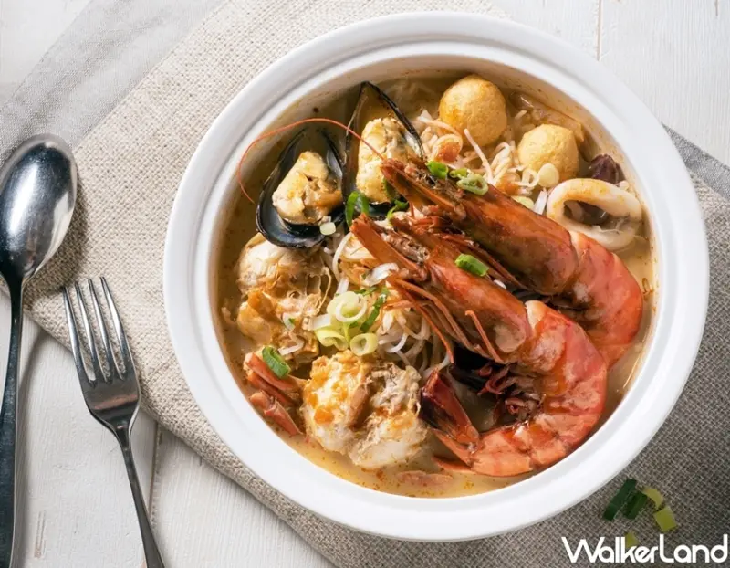 另設計充滿異國風的雙人分享餐,包含經典法式名菜勃根地紅酒燉牛肉外,還有超霸氣的新加坡鮮蝦叻沙麵,用大量海鮮食材、薑黃、香茅與多種辛香料熬製出的濃郁叻沙湯頭,清淡椰奶使其味道柔和,再搭配比手掌大草蝦、整隻螃蟹、新鮮小卷、淡菜等,雙人共享只要999元。
