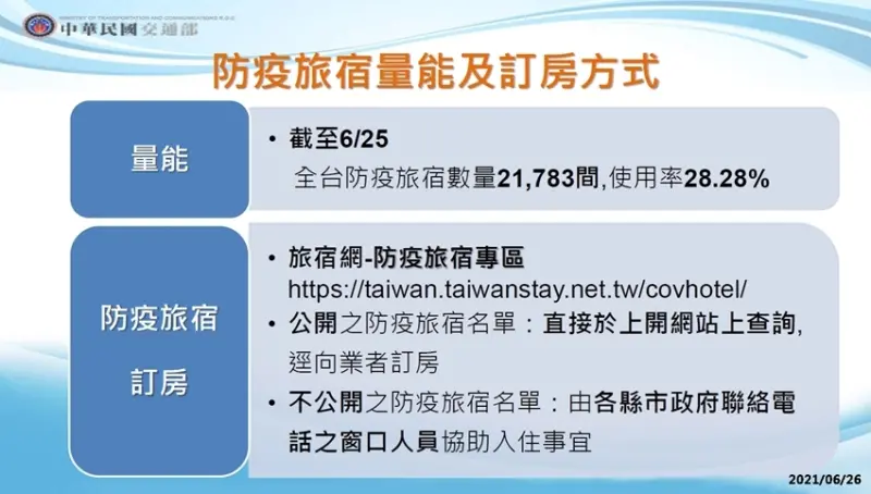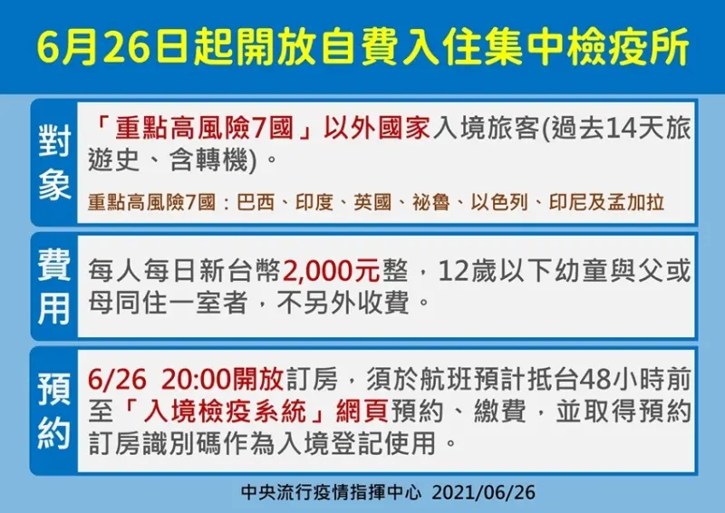 並且,為了有效防堵COVID-19變異株,6月27日起「重點高風險7國(巴西、印度、英國、祕魯、以色列、印尼及孟加拉)」以外之國家入境旅客(過去14天旅遊史、含轉機)住宿需要,將開放集中檢疫所供民眾自費使用,於今日晚間8時開放訂房。