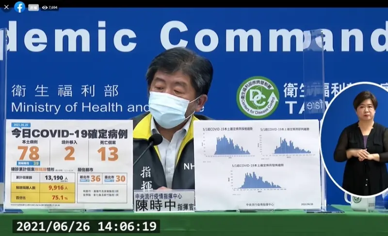 中央流行疫情指揮中心今(26)日公布國內新增78例本土病例,為36例男性、42例女性,年齡介於未滿5歲至80多歲,發病日介於今(2021)年6月11日至6月25日。個案分佈以新北市36例最多,其次為臺北市30例、桃園市、基隆市及屏東縣各3例,苗栗縣、彰化縣及新竹縣各1例。其中雙北地區以外縣市12例中,10例為已知感染源、2例關聯不明;相關疫情調查持續進行中。