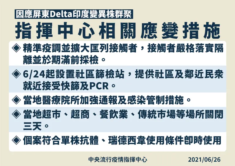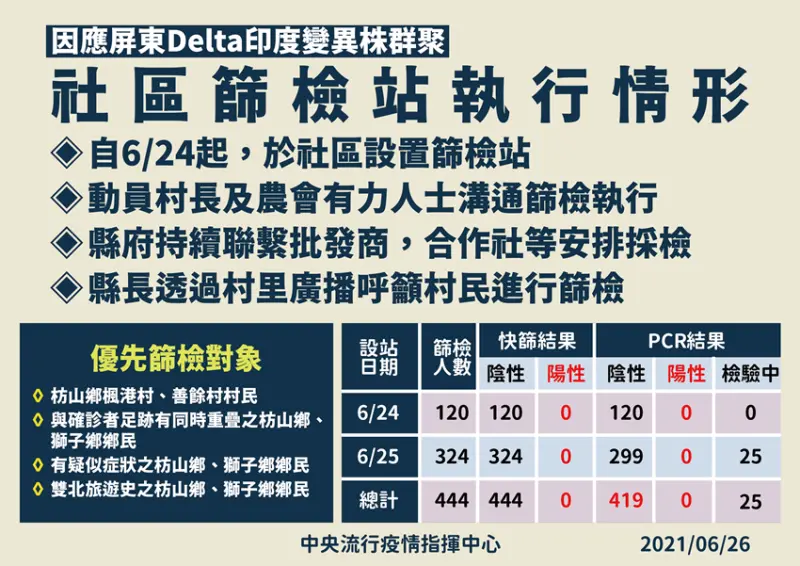 二、6月24日起於當地設置社區篩檢站,籲請足跡重疊民眾篩檢,並加強民眾溝通配合篩檢,截至6月25日PCR篩檢共419人皆為陰性;另針對確診個案公布社區足跡點,並完成公共場所消毒。