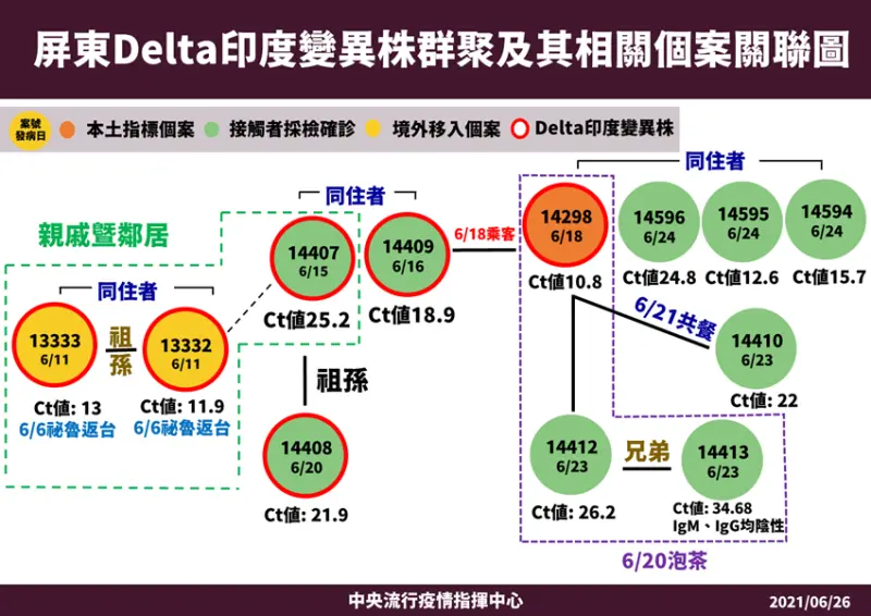 此外,有關屏東COVID-19 Delta印度變異株群聚及其相關感染事件,目前累計12例確定病例,其中6例經基因定序後,均為Delta印度變異株,分別為秘魯境外移入確診祖孫2人(案13332、13333)及案14298、14407、14408、14409。