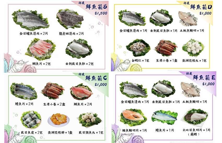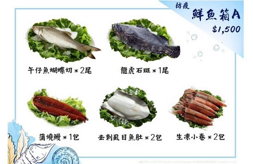 想要新鮮海味一次買齊,最簡單的方法就是購買「桃園防疫鮮魚箱」,這是由桃園區漁會與全國漁會共同合作推出的海鮮超值組合,有1,500元、1,000元兩種價位、共五款組合可以挑選,讓你不出門也能飽嚐台灣各地海鮮美味!