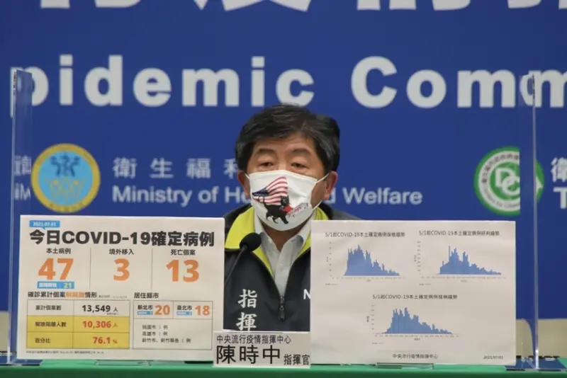 中央流行疫情指揮中心今(1)日公布國內新增47例本土病例(其中21例為居家隔離期間或期滿檢驗陽性者),為22例男性、25例女性,年齡介於未滿5歲至90多歲,發病日介於今(2021)年6月22日至6月30日。個案分布以新北市20例最多,其次為臺北市18例、桃園市5例、高雄市2例,新竹市及新竹縣各1例;其中28例為已知感染源、3例關聯不明、16例調查中,相關疫情調查持續進行中。