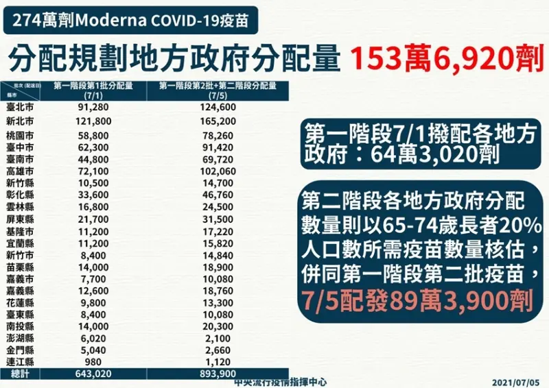 此外,針對疫苗分配量,第一階段在7月1日已配發64萬3020劑,第二階段預計在7月5日配發89萬3900劑,以64歲至74歲長者、20%人口數配發。上一波針對高風險地區提供高於30%人口數配發,現包含長照、洗腎、高齡高風險族群,目標這一波能到50%。