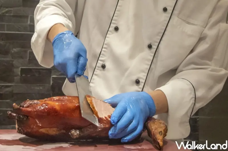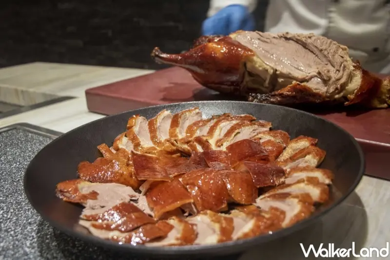 第一吃以手工製作並以老麵發酵的鴨摸摸餅皮,夾入厚實的片皮鴨胸肉,可搭配蔥、小黃瓜與甜麵醬;第二吃則是肉飽扎實的鴨腿斬件。