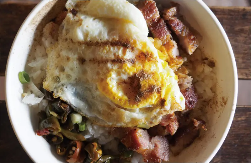 平時工作和生活有許多原住民同事與朋友,黃溫庭難得有機會品嚐過部落家常式的烤肉飯早餐,看起來很像縮小版的便當,大碗公的白飯放上烤肉、荷包蛋和炒辣椒, 有別於供應給觀光客的部落石板烤肉風味餐,樸實簡單更貼近原住民的日常生活。