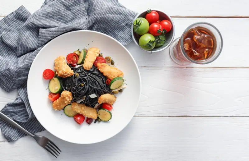 ▲ 咔滋咔滋墨魚麵:特選旗魚塊與墨魚麵組合,二重鮮美迴盪味蕾,健康的享受美食。