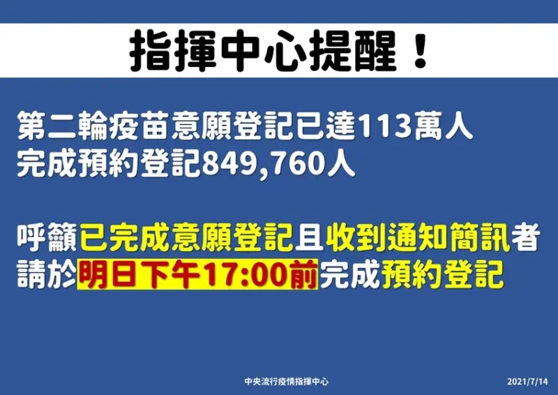 此外,目前針對第二輪疫苗施打意願登記已達113萬人,而完成預約登記的人數有849,760人,指揮中心呼籲已完成意願登記且收到通知簡訊者,請於明日(15)下午17:00前完成登記,疫苗要打到身體裡才有用、請國人盡快登記預約。