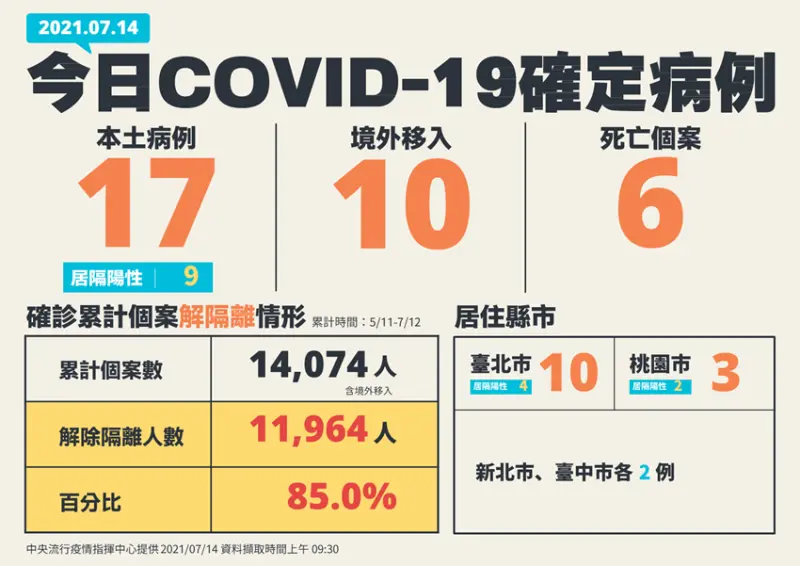 中央流行疫情指揮中心今(14)日公布國內新增17例本土病例(其中9例為居家隔離期間或期滿檢驗陽性者),為11例男性、6例女性,年齡介於未滿10歲至80多歲,發病日介於今(2021)年7月7日至7月13日。個案分布以臺北市10例為最多,其次為桃園市3例、新北市及臺中市各2例;其中10例為已知感染源、3例關聯不明、4例調查中,相關疫情調查持續進行中。
