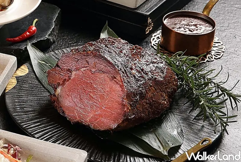 而超大塊700克的沙朗牛排則是選用來自拉丁美洲友邦的拉美牛,這是台灣目前牛肉進口量第二大的產區,當地牛隻以天然放牧草飼為主,肉質具穀物、草香等特色,又擁有低脂高蛋白的特性。主廚先以混合了蒜碎、洋蔥、黑胡椒、椰糖的醃料塗裹整塊牛肉,靜置一天,然後入烤箱先大火封汁、再小火慢烤至適當熟度,切塊品嚐,肉香撲鼻,鮮腴多汁,配搭加了印尼甜醬油的大馬黑胡椒醬,更添美味。