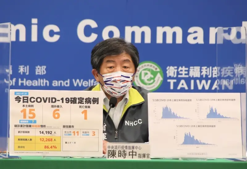 中央流行疫情指揮中心今(19)日公布國內新增15例本土病例(其中7例為居家隔離期間或期滿檢驗陽性者),為8例男性、7例女性,年齡介於未滿5歲至80多歲,發病日介於今(2021)年7月14日至7月17日。個案分布以新北市11例為最多,其次為桃園市3例、臺北市1例;其中9例為已知感染源,餘6例關聯不明,將持續進行疫情調查,以釐清感染源。