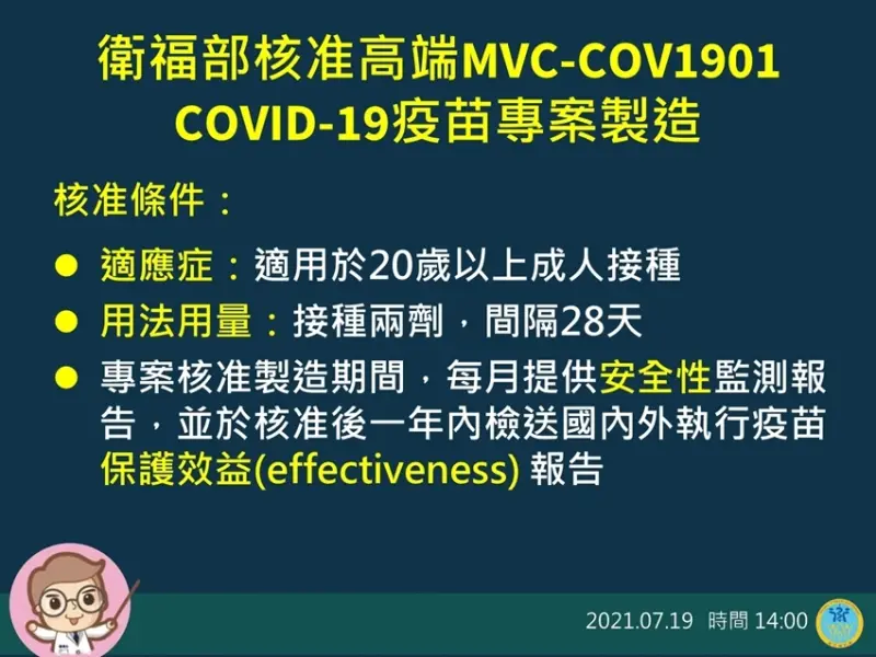 此外,針對國人所關心的防疫議題「國產疫苗」,指揮官陳時中表示:核准高端MVC-COV1901新冠肺炎疫苗專案製造。