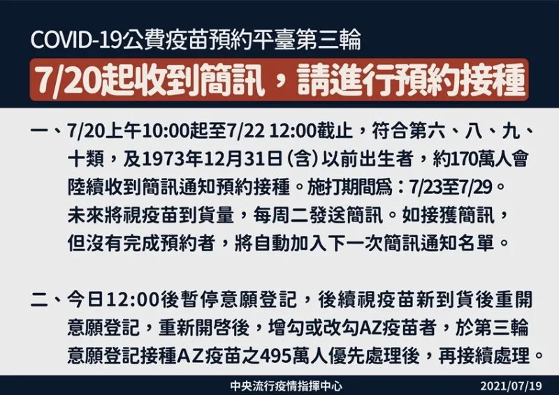而疫苗接種議題,指揮官陳時中表示:將針對第六、八、九、十類及1973年12月31日(含)以前出生民眾,約170萬人會陸續收到簡訊,預約接種期程至7月22日中午12時截止。