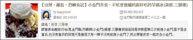 黃厝三層樓的命名就是...因為所在的建築物是「三層樓」,真是直率可愛的命名方式!店裡提供的是好吃又美味的芋頭大餐,在小金門可是非常有名的唷!看看照片裡芋頭米粉那一塊塊芋頭加上牡蠣,還有好吃的芋頭冰,上面的芋泥呈現出像是冰淇淋般綿密的光澤呢!