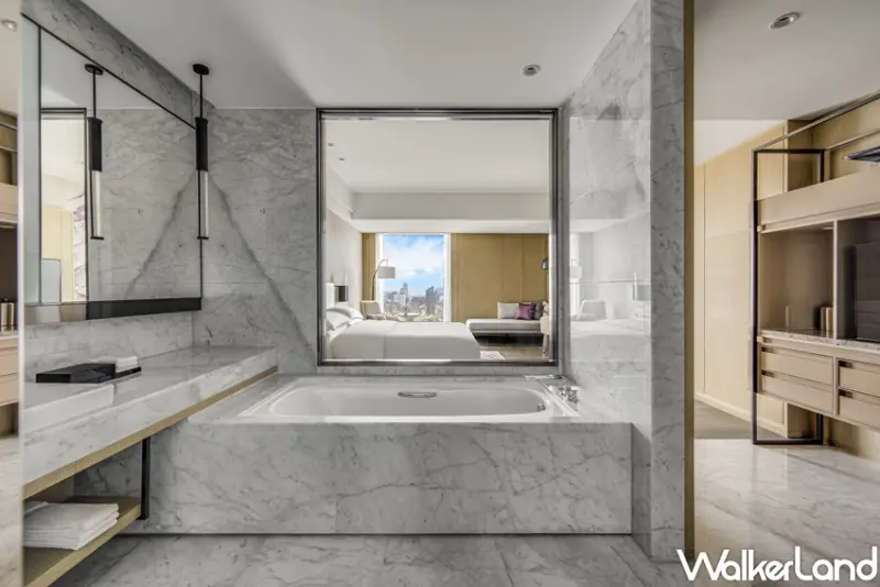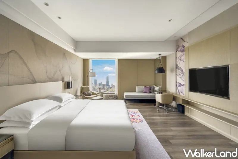 高雄萬豪酒店為全台最大的萬豪酒店,客房寬敞舒適有14坪,設有保險箱、迷你吧檯、55吋液晶螢幕電視、寬敞舒適沙發、高級寢具,偌大落地窗能俯瞰蜿蜒愛河美景或是繁華市容,均配有乾濕分離衛浴、泰國頂級香氛品牌THANN沐浴用品及浴袍,為旅人提供歇息的舒適空間。