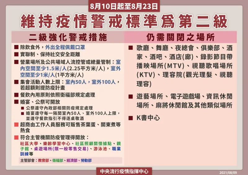 今日記者會現場,指揮中心宣布,考量國內疫情趨於穩定及參酌其他國家防疫措施調整經驗,經與各相關單位討論及評估後,明天(8/10)起至8月23日仍維持疫情警戒標準為第二級。