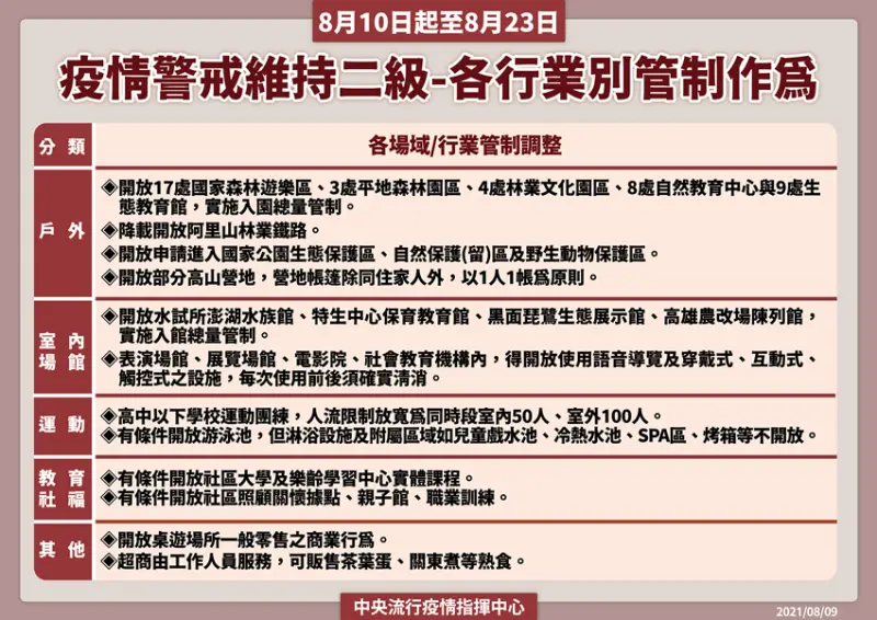 相關管制措施包括:除飲食外,外出全程佩戴口罩。 實聯制、保持社交安全距離。婚宴、公祭可開放,但須遵守相關防疫規定。超商由工作人員服務可販售茶葉蛋、關東煮等熱食。不過八大行業及K書中心等場所仍維持關閉。![]()